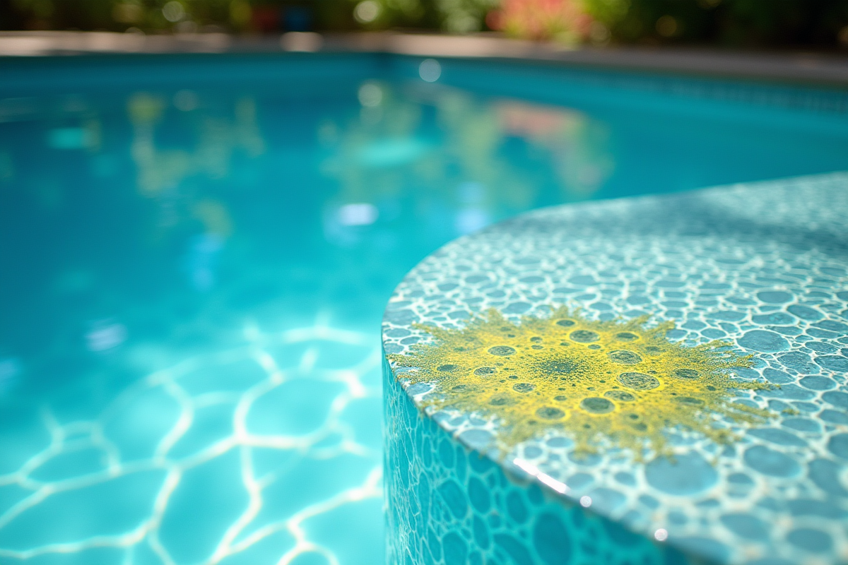 La présence d’algues moutarde n’est pas toujours évidente à détecter. Elle se présente sous forme d’une fine pellicule jaune, presque dorée, qui tapisse parois et fond du bassin. Elle imite le pollen ou le sable, mais un détail ne trompe pas : ces dépôts persistent, même après le passage de l’aspirateur ou du balai.