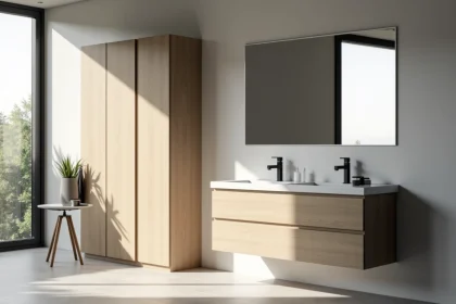 La salle de bain n’échappe pas à la tendance taupe. Optez pour des carreaux de céramique taupe et des accessoires en bois pour une ambiance spa. Les serviettes blanches et les plantes vertes apporteront la touche finale.