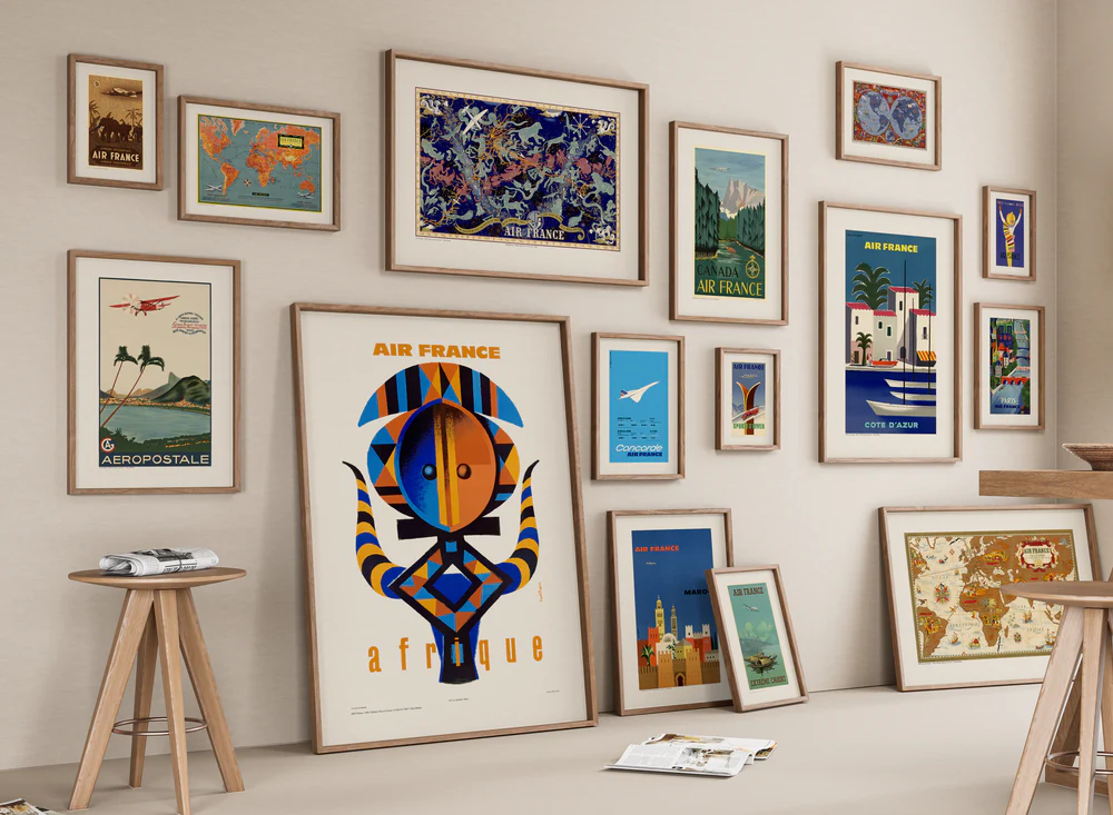 Avant de commencer à accrocher vos cadres, réfléchissez à un thème ou à une palette de couleurs pour votre mur. Cela peut être basé sur un style particulier, comme le vintage, le moderne, ou le bohème, ou sur une gamme de couleurs cohérente. Une palette de couleurs harmonieuse aide à unifier les différentes œuvres d’art et les cadres, créant un ensemble visuellement agréable. Les affiches, qui peuvent être très colorées ou stylisées, doivent être sélectionnées en fonction de ce thème ou de cette palette pour maintenir la cohérence visuelle.